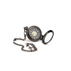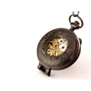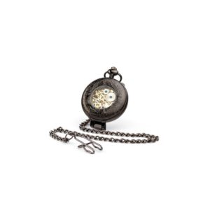 Zegarek kieszonkowy w stylu vintage – przeznaczony dla wyjątkowej, ceniącej styl osoby. Egzemplarz jest wykonany ze stali uszlachetnianej w kolorze starego srebra. Dodatkowe rzeźbienia z przodu zegarka podkreślone są poprzez czarny połysk zegarka. Przez przednią lekko powiększającą szybkę zegarka pięknie prezentuje się czarny cyferblat z połyskującymi miedzianymi rzymskimi cyframi. Zastosowane szkiełko mineralne zabezpiecza zegarek przed uszkodzeniami i zarysowaniem. Przez otwór w przedniej ściance zegarka widoczne jest „mechaniczne serce zegarka” a białe, fantazyjne wskazówki nadają unikatowego wyglądu. Zegarek ten jest zegarkiem wodoodpornym, nakręcanym ręcznie, nie wymagającym baterii. Otwierany automatycznie poprzez przycisk znajdujący się przy mechanizmie do nakręcania.