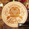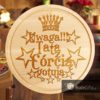 Średniej wielkości okrągła deska kuchenna do krojenia ozdobiona indywidualnym wzorem wykonanym za pomocą technologii grawerowania laserowego.
