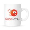 Kubek z napisem w języku angielskim i uchwytem w kształcie klucza.