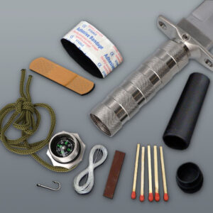 W rękojeści znajduje się zestaw survivalowy – haczyk, żyłka, zapałki, draska, kompas i plaster opatrunkowy.