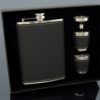 Zestaw upominkowy składający się z piersiówki o pojemności 240ml, 4 kieliszków 4 x 35 ml i lejka. Wszystko zapakowane w pudełko.